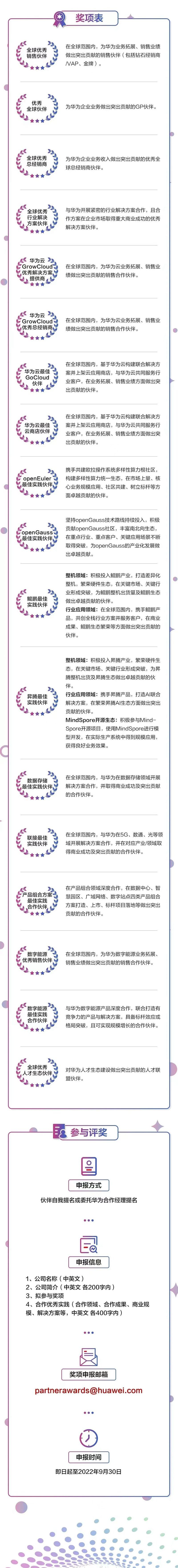 据了解,华为2022年度优秀合作伙伴奖项评选的奖项包括:全球优秀销售伙伴、优秀全球伙伴、全球优秀总经销商、全球优秀行业解决方案伙伴、华为云GrowCloud优秀解决方案提供商、华为云GrowCloud优秀总经销商、华为云最佳GoCloud、华为云最佳云商店伙伴、openEuler最佳实践伙伴、openGauss最佳实践伙伴、鲲鹏最佳实践伙伴、昇腾最佳实践伙伴、数据存储最佳实践伙伴、联接最佳实践伙伴、产品组合方案最佳实践合作伙伴、数字能源优秀销售伙伴、数字能源最佳实践合作伙伴、全球优秀人才生态伙伴。