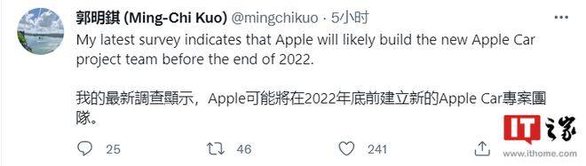 此外,郭明錤表示苹果可能将在 2022 年底前建立新的 Apple Car 团队,此前苹果造车项目几经波折,八年换了四个负责人。