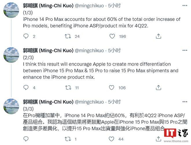 IT之家了解到,郭明錤上周表示,由于需求强劲,苹果要求制造合作伙伴增加 iPhone 14 Pro / Max 系列机型的产量。今天他指出,iPhone 14 Pro Max 约占 Pro / Max 系列机型总订单增长的 60%。