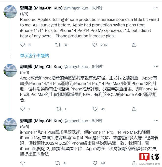 随着对iPhone 14 Pro / Max 系列机型的需求增长,苹果已要求其供应商从 iPhone 14 / Plus 的生产转向 iPhone 14 Pro / Max 的生产。郭明錤表示,据报道,苹果的 iPhone 14 和 iPhone 14 Plus 的需求“明显乏善可陈”。