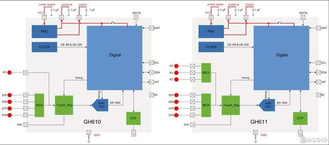 采用双路入耳检测加上电容检测方案只对电极响应的特性,使其比传统光学检测方案具有更低的误识别率。芯片内部集成PMU、MCU,算法在片上独立运行,直接向主控上报事件,无需主控做数据处理。