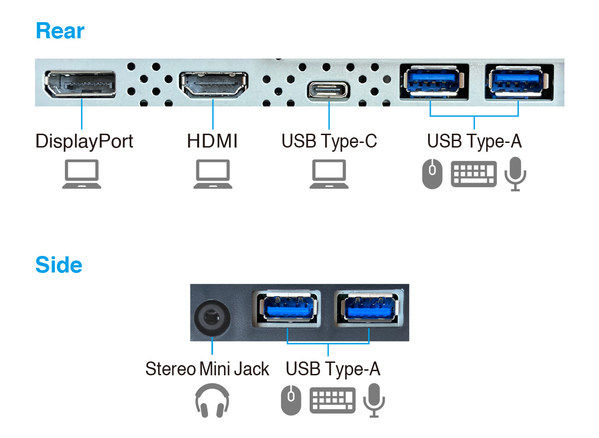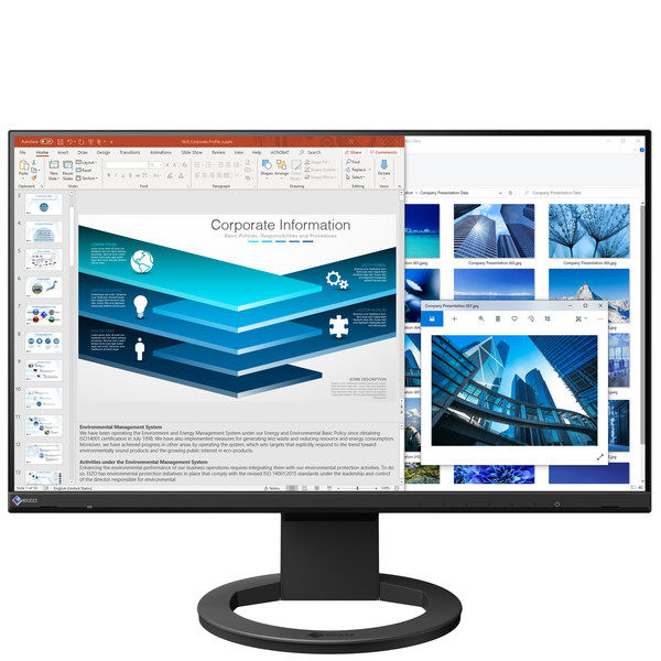 FlexScan EV2480配备了一个USB Type-C端口,允许用户显示视频、播放音频、传输USB信号,并为连接的设备供电。这种方便的多用途连接使得用户在工作站之间移动或在办公室以外的地方工作时,可以更快更便捷地连接笔记本电脑。它还配备了HDMI和DisplayPort输入,为用户提供更大的便利。