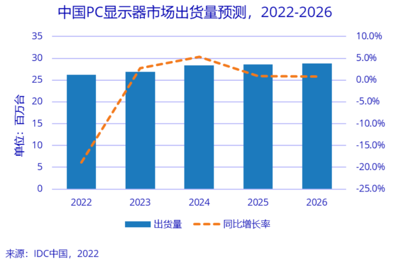 IDC 预计,2022年中国显示器出货量将下降18.9%。一方面受宏观经济影响企业采购减少;另一方面消费者购物意愿下降。虽然短期内,市场需求受到抑制,但随着疫情逐步稳定,各省刺激消费政策陆续出台,未来几年显示器市场将慢慢恢复。