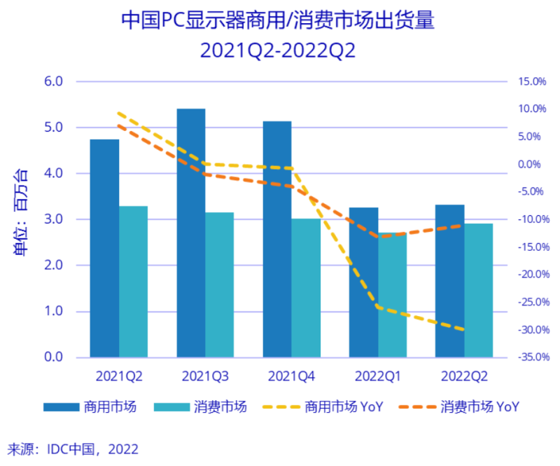 本文引用地址:http://www.eepw.com.cn/article/202209/438788.htm其中商用市场第二季度出货量332万台,同比下降29.9%。政教订单大幅缩减,政教市场同比下降41.1%;大客户预算缩减,同比下降26.3%;中小企业面临生存压力,同比下降23.5%。因市场需求下降,低价刺激市场作为增长的驱动力也不足够。