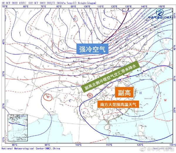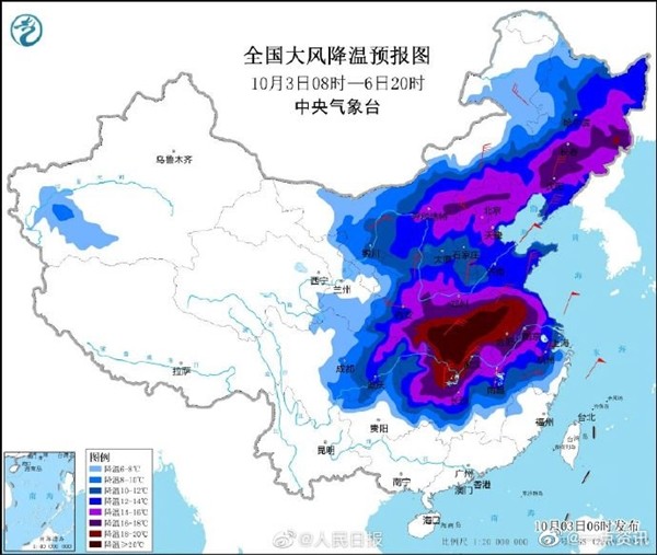 今天早上6时,中央气象台继续发布寒潮蓝色预警,预计今日08时至6日20时,中东部大部地区气温普遍下降8~12℃。此外,江南、华南北部、江汉、江淮等地仍有较大范围高温,5日后受冷空气影响,高温逐渐缓解。
