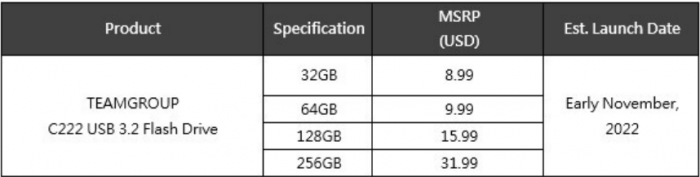 十铨首批C222 USB 3.2闪存盘将在日本亚马逊、北美亚马逊和新蛋网上市,提供32GB、64GB、128GB和256GB的容量。价格从8.99美元到31.99美元不等。