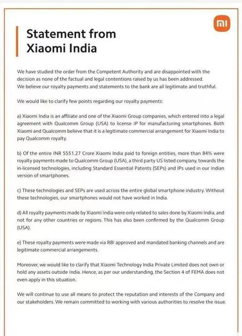 作为小米集团的子公司,小米印度与高通签订了法律协议,使用高通的知识产权用于生存智能手机。小米和高通都认为支付这笔专利费用是合乎法律的行为。