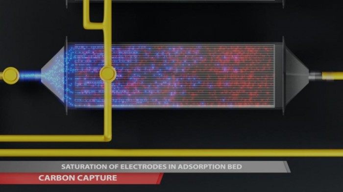 气体从一侧进入每个烟囱,并通过构成烟囱的电极,其中的二氧化碳被吸收。剩余的气体简单地通过烟囱并从另一侧排出。一旦烟囱中的二氧化碳达到饱和,进入的气体就会停止,纯二氧化碳就会从烟囱的另一侧流出。以交替循环的方式平行安装烟囱,可以使进入的混合气体和流出的纯二氧化碳持续流动。图片由Verdox公司提供