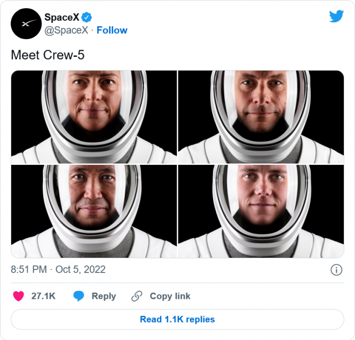 Crew-5在经历了长达29小时的旅程后,将于美国东部时间明天下午4点57分抵达国际空间站。在此之后,Crew-4将搭乘飞船从国际空间站返回,完成他们在国际空间站为期五个半月的任务。