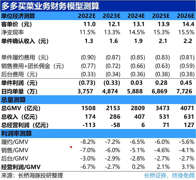 落实到财务模型上,考多多买菜已经领跑社区团购市场,我们上调了对多多买菜的预测。预计到2026年能实现约4000亿的GMV规模,并贡献约130亿的经营利润,对应买菜业务的经营利润率(比GMV)会从,22年的-7.5%,优化到2026年的3.1%,对应件单盈利四毛五(横向对比来看,京东自营商超的稳态的经营利润率应当在4%左右。)