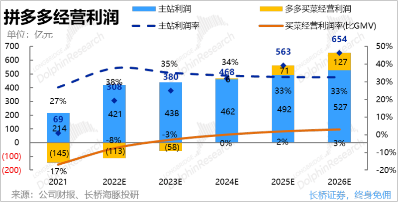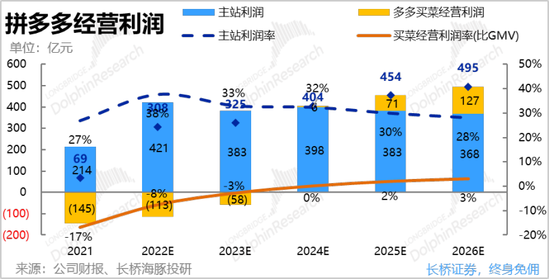 在此情境下,预计2025年拼多多能实现约454亿的经营利润,其中主站能贡献383亿利润,对应30%的利润率,多多买菜盈利的预测与先前相同。