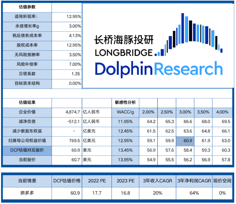 基于上述保守情形下的财务预测,我们根据DCF模型估算出拼多多的合理估值在770亿美元,对应每股股价在$60.9。从相对估值角度,对应2022年17.7x P/E,2023年337亿净利润的16.8x P/E。