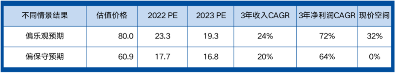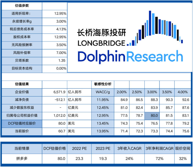 基于上述财务预测,根据海豚君的DCF模型,我们估算出在中性情形下,拼多多的合理估值在1027亿美元,对应每股股价在$80。按相对估值来看,相当于2022年303亿净利润的23x P/E,对应2023年367亿净利润的19x P/E。