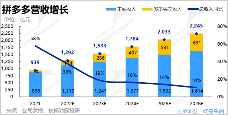 ③不过,考虑到拼多多的用户渗透见顶,而客单价由于无法向上突破品牌和品质电商,难以上行,假设价格增长与CPI同速,因此预计2023-2026年拼多多的总营收增速会从19%快速下降到10%。
