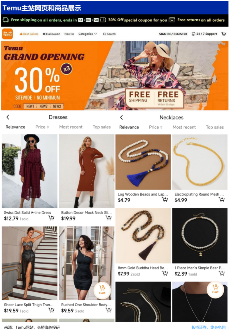 从商品定位上,Temu也延续了Shein和Shopee成功背后的极致性价比定位。当前主要以单价在$20以内的服装配饰等为主,不过据公司沟通,Temu的定位是全品类平台。而在初步获客阶段,Temu对新用户提供全场30%的折扣,并暂时为金额超过$49的订单免收运费。