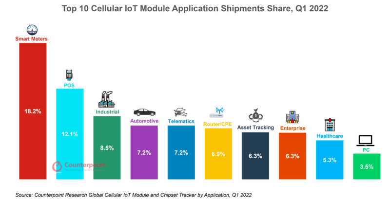 2022年Q1全球蜂窝物联网应用排名