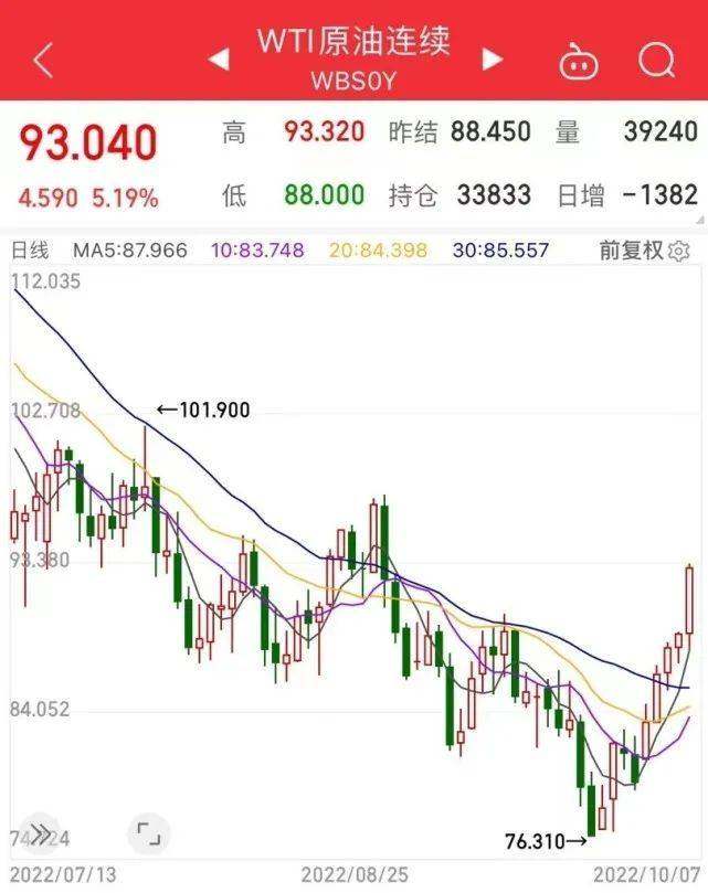 “之前市场普遍预期欧佩克+减产是在50万-100万桶/天之间,结果沙特主导的欧佩克+联盟直接减产200万桶/天,目的就是对冲经济衰退导致的需求下降。远超市场预期的大幅度减产,直接导致油价持续上涨,目前油价重新回到90美元-100美元/桶的震荡区间。”朱光明解释道。