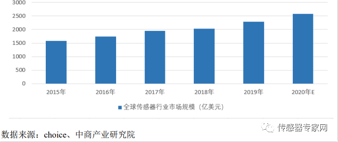 近年来,全球物联网产业的快速发展带动传感器市场进一步增长。2013年全球传感器行业市场规模突破百亿美元。随着传感器的应用场景不断拓展,市场规模持续扩大,2018年全球传感器行业市场规模突破2000亿美元。预计2020年,全球传感器市场规模有望达到2580亿美元。
