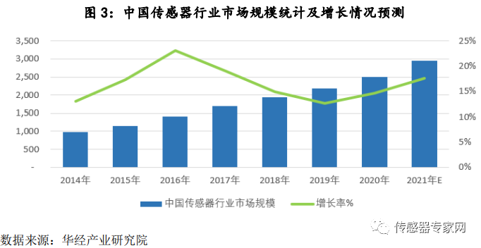 根据《2022-2027年中国传感器行业市场供需现状及投资战略研究报告》数据显示, 在物联网快速发展的大背景下,2020年中国传感器市场保持稳定上涨趋势,整体市场规模达到2510.3亿元,同比增长14.66%。预计2021年市场规模将达2951.8 亿元,增速达17.6%。