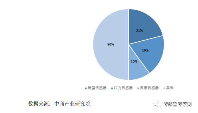 另外,根据中商产业研究院数据显示,在全球传感器市场中,流量传感器、压力传感器和温度传感器所占比重较大。其中,流量传感器约占21%,压力传感器占比19%,温度传感器占比也在10%以上。此外,位移传感器、速度传感器、电量传感器、光纤传感器以及新兴传感器等其他传感器合计占比也接近一半。