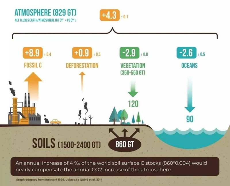 再生农业受到关注,还在于它对气候变化的减缓作用。据2015年联合国气候大会“千分之四”(4 per 1000)倡议的估算,如果通过再生农业,每年把全世界土壤表层的有机碳增加0.4% 的话,就能吸收掉大量碳排放,甚至可以停止大气中二氧化碳的增加。