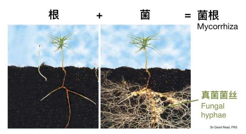 这些微生物和植物之间建立了高效的合作关系。右图的白色网状结构是真菌的菌丝,它们和植物的根连在一起,形成了菌根(Mycorrhiza)。