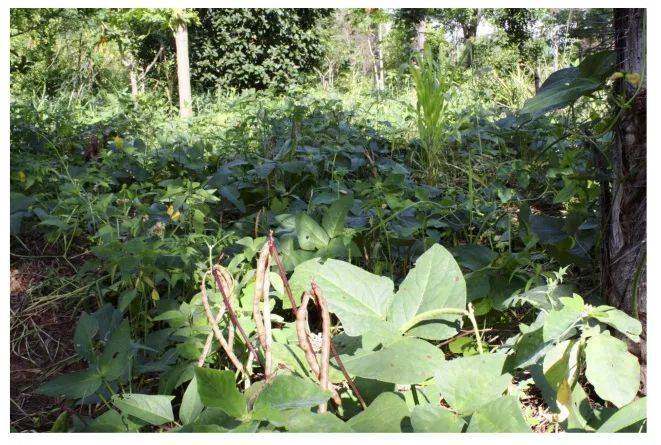 南美洲巴拉圭小农Victorino位于雨林区的森林农场,开荒时保留了一部分原生植物,并在林下种了玉米、木薯、菜豆、甘蔗等多种作物,还养着几头猪和一群鸡。