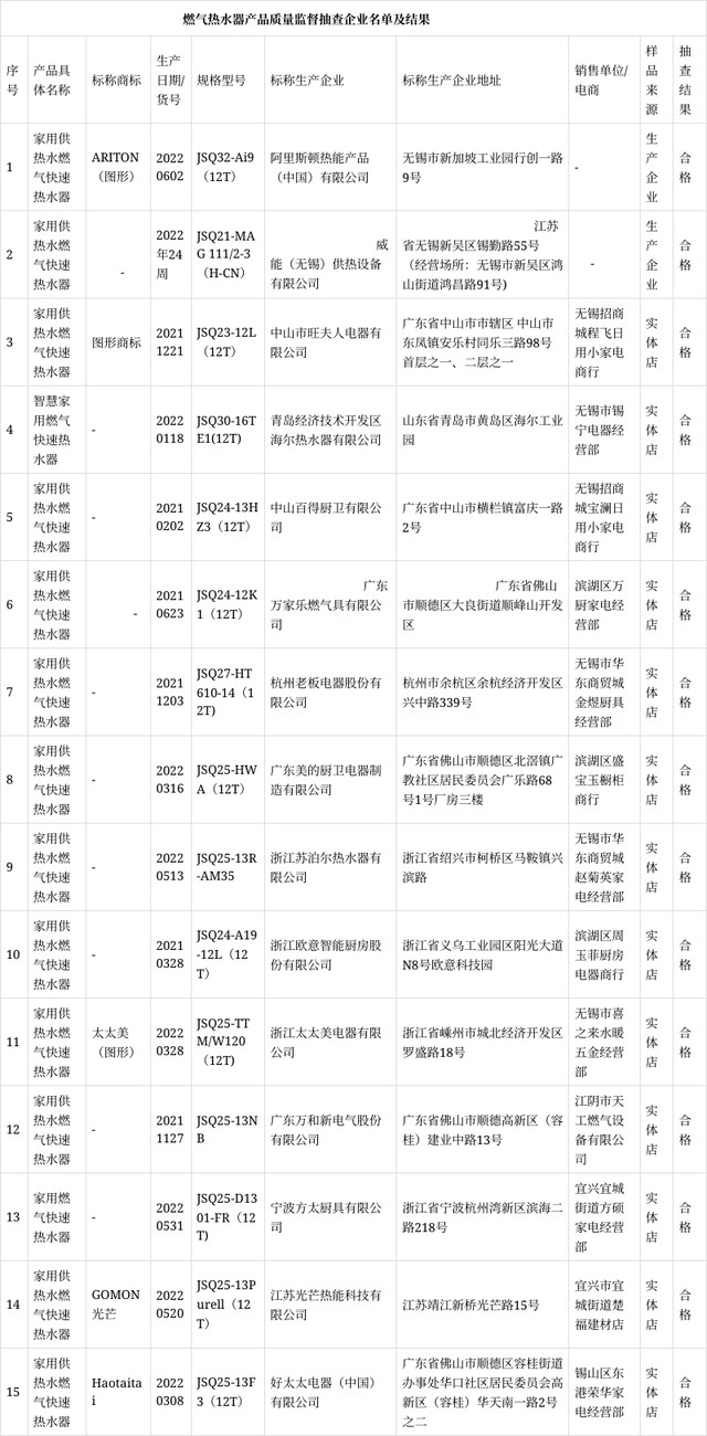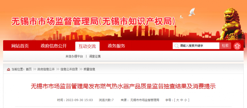 本文标题:江苏省无锡市市场监管局抽查15批次燃气热水器产品合格率100%