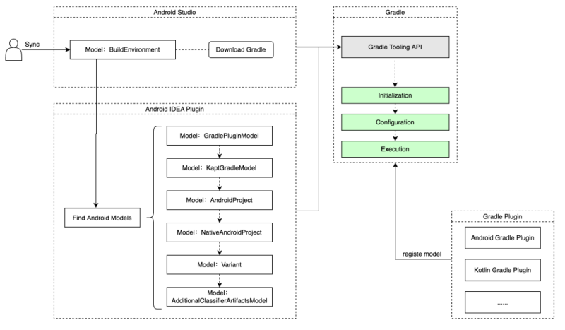 如上图,对于 Gradle 来说,Sync 流程中 Android Studio 会通过 Gradle Tooling API 从 Gradle 侧获取一系列所需的 Gradle Model,除 Gradle 自身外,Gradle Plugin 也可以提供自定义的 Gradle Model。另外 Sync 流程中 Gradle 会经历自身定义的生命周期,聚焦此视角梳理流程如下: