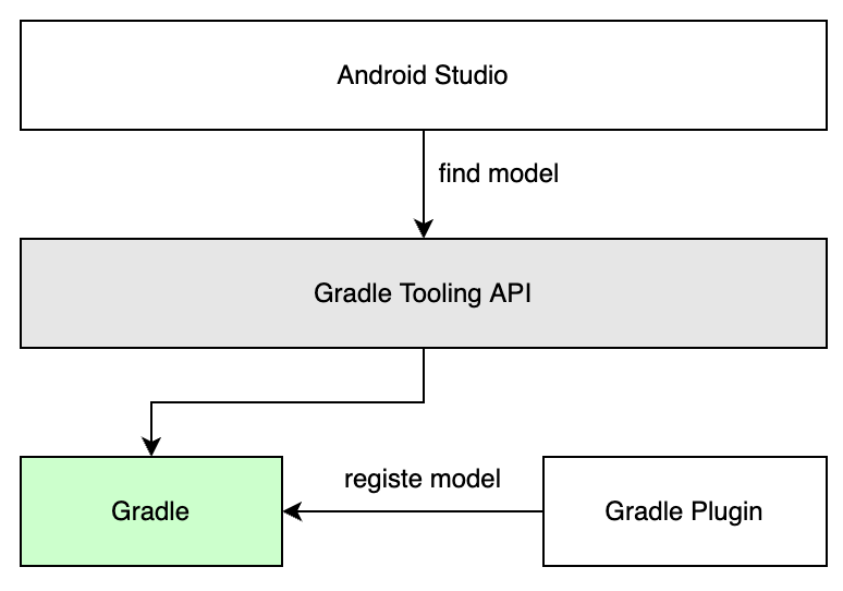 BuildEnvironment 是 Gradle 提供的 Gradle Model,Gradle Model 是一个非常重要的概念,当 IDE 通过 Gradle Tooling API 和 Gradle 交互时,传输的就是各种各样的 Model,比如 Gradle 自带的 GradleProject 、 BuildEnvironment 等,另外也可以在 Gradle Plugin 中通过 ToolingModelBuilderRegistry 注册自定义的 Model,如 Android Gradle Plugin 中注册了 AndroidProject Model,那就可以通过 Gradle Tooling API 获取 Android 项目特有的 AndroidProject Model,从而获取由 Android Gradle Plugin 提供的 Android 应用相关工程信息。