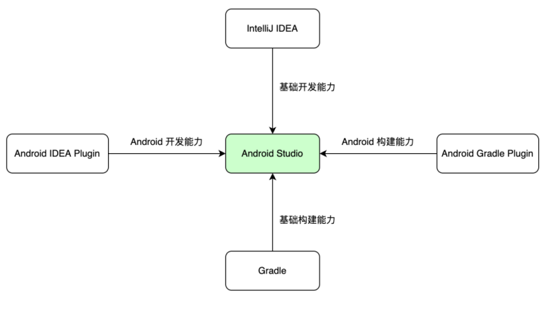 IDE 层面:Android Studio 基于 IntelliJ IDEA 扩展而来,复用了 IntelliJ IDEA 强大的代码编辑器和开发者工具等 IDE 基础能力,在此之上 Android Studio 提供了更多提高 Android 构建效率的功能,如 Android 模拟器、代码模版等等。另外 Android Studio 也将自身专业的 Android 应用开发能力反哺给 IntelliJ IDEA,以 Android IDEA Plugin 的形式,使 IntelliJ IDEA 支持 Android 应用开发,二者互相赋能,相辅相成。