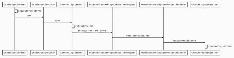 在 Android Studio 中触发 Sync 操作后,会从最上层的入口类 GradleSyncInvoker 调用到实际负责解析 Gradle 构建信息的 GradleProjectResolver,调用链如下图所示: