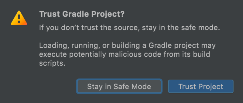 - isPreviewMode:是否要启用预览模式,Android Studio 首次打开未知来源项目时,会让开发者选择项目的打开方式,如下图,若选择 [Stay in Safe Mode] 则会以“预览模式”运行项目,表示 IDE 仅可以浏览项目的源代码,不会执行或解析任何构建任务和脚本