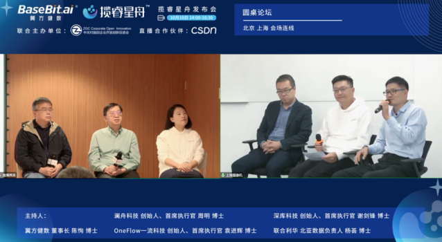 2022年10月10日,翼方健数公司通过北京和上海两地连线的方式召开了「揽睿星舟」新产品发布会。发布会由中关村融创企业开放创新促进会联合主办,国内专业开发者社区CSDN进行线上直播。分别邀请到了来自中国工程院院士,清华大学讲席教授、智能产业研究院(AIR)院长张亚勤院士、上海市人工智能行业协会秘书长钟俊浩先生、科技部高技术研究发展中心研究员稽智源先生进行致辞。潞晨科技创始人尤洋教授、Deargen公司Business Development Leader Andrew Ha先生分别代表平台的合作伙伴以及客户进行线上分享,并由翼方健数首席执行官罗震博士与首席科学家张霖涛博士对本次发布的战略意义及新产品分别进行介绍说明。在发布会的最后,北京上海连线,由澜舟科技创始人兼首席执行官周明博士、OneFlow一流科技创始人兼首席执行官袁进辉博士、深库科技创始人兼首席执行官谢剑锋博士、联合利华北亚数据负责人杨荟博士与翼方健数董事长陈恂博士展开圆桌讨论。