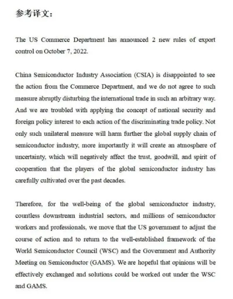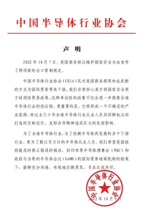 2022年10月7日,美国商务部以维护国家安全为由宣布了两项新的出口管制规定。中国半导体行业协会对此发表声明如下: