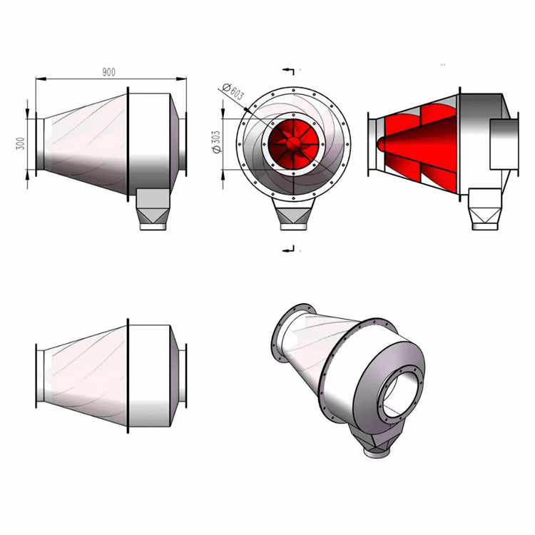 2、挡泥板:壳体上设有多个隔板,隔板上设有通孔。各膜片通孔错开。隔板上设有若干导叶,用于引导废气并截留隔板上的粉末。隔板叶片有一定的耐磨措施和适当的旋转角度。