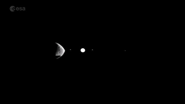 欧空局在木星的视频之后,又在3月份拍摄了一个较短的序列,显示较大的卫星Phobos在Deimos前面经过。