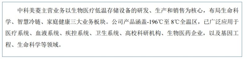 中科美菱是深交所上市公司长虹美菱(SZ000521,股价4.80元,市值49.44亿元)与中国科学院理化技术研究所合资成立的高新技术企业。中科美菱主营业务以生物医疗低温存储设备的研发、生产和销售为核心,专注于生命科学领域,致力于为用户提供低温存储冰箱、液氮生物容器、医用洁净工作台、生物安全柜、离心机等设备和服务。根据中国医疗器械行业协会的数据,2020-2021年公司的生物医疗领域低温存储专用设备,在国内品牌中的市场占有率排名前三。