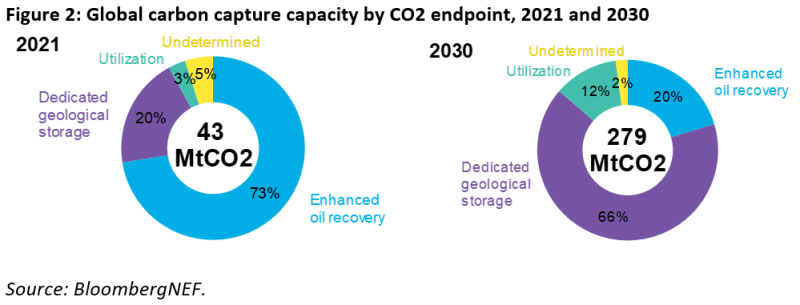 捕获的 CO 2的目的地也将因现状发生重大变化。2021 年,约 73% 的捕集 CO 2用于提高采收率作业。到 2030 年,在地下深处储存 CO 2将超过石油采收率,成为 CO 2的主要目的地,其中 66% 将流向专门的储存地点。这种变化是由鼓励储存而不是利用 CO 2的立法以及旨在使用碳捕获和储存 (CCS) 作为脱碳途径并且必须储存 CO 2以实现其目标的项目推动的。