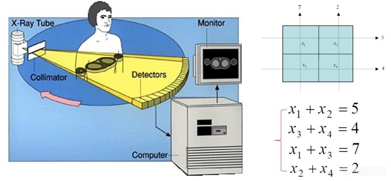 简单理解,CT就是求解一个线性方程组,最终得到的结果就是CT图像。CT扫描就是构造方程组的过程,每一条被探测器接收的射线就代表了一个方程。对二维断层成像而言,要想得到好的求解结果,需要平面内任意方向的射线。这也是要求射线源-探测器组合相对于成像目标旋转360度的原因(出于严谨考虑,这里声明不考虑短扫描等情形)。