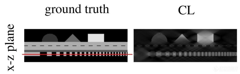 这是CL避免不了的问题。首先通过下图来了解一下层间混叠是什么样子。其表现就是横向的边缘被弱化了。为什么会出现这个问题呢?这得从傅里叶中心切片定理讲起,还是算了吧,简单点理解就是缺少了横向穿过物体的射线。为什么会缺少?因为这个方向射线穿不透啊,回忆一下前面一米长的PCB。