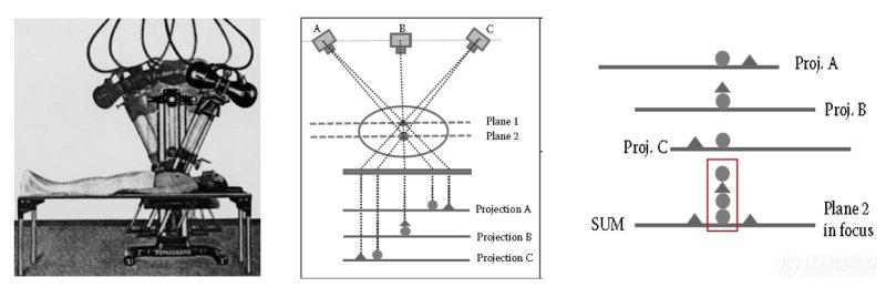 可以通过下图了解传统层析成像的原理。通过采集不同角度的投影数据(那时还只有胶片),将胶片简单叠加在一起,其中一层的数据会被增强(这一层称为焦平面)。下图中Plane 2的数据(以圆形代表其细节)就被增强了。传统层析成像,每次只能增强一个焦平面内的结构,而其它层的图像仍然是模糊的。