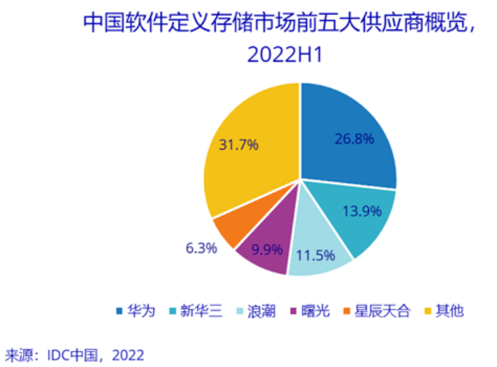 从不同数据存储形式来看,2022上半年,在SDS市场整体负增长的情况下,对象存储出货比例持续上升,同比增长超过27%。受挖矿限制影响最大的文件存储出货同比大幅降低,市场份额降至42.4%;IDC预测,文件存储在未来五年中仍会维持在4成左右的市场占比。块存储市场在2022上半年同比增长1.6%,随着用户对数据安全等问题的关注度提升,凭借较高的读写效率,块存储将继续受到存储量大时对读写效率要求较高场景的青睐。