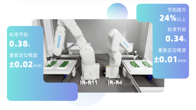 其中,IR-R4速度比肩最快同类产品,节拍时间仅为0.34S,节拍提升24%以上,重复定位精度可达±0.01mm,助力高精度加工产线大幅度提升效率。