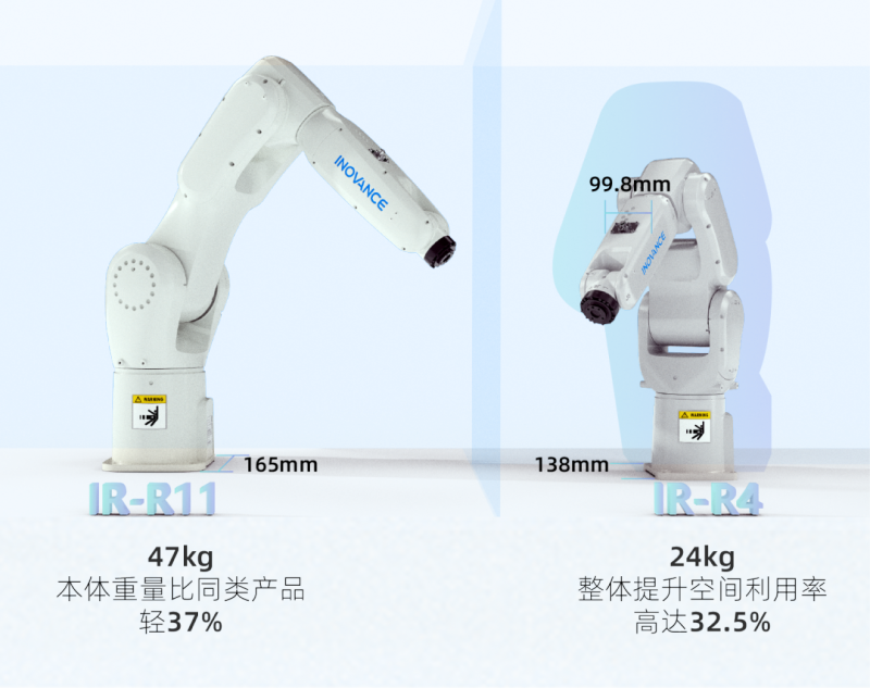 IR-R4前臂宽度最大仅99.8mm,本体重量为24kg,底座尺寸138mm*138mm,整体提升空间利用率高达32.5%。