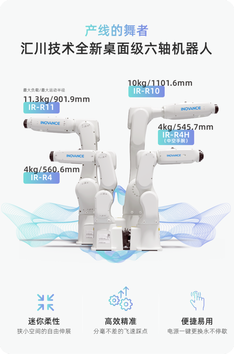 IR-R4(负载4.0kg)/IR-R11(负载11.3kg)桌面级六轴机器人,凭借其快速节拍和紧凑结构,可广泛应用于快速交付、追求极致生产效率的行业,如3C行业、光伏行业,以及装配和涂胶等应用场景,满足用户省时、省力、高效等多重需求。
