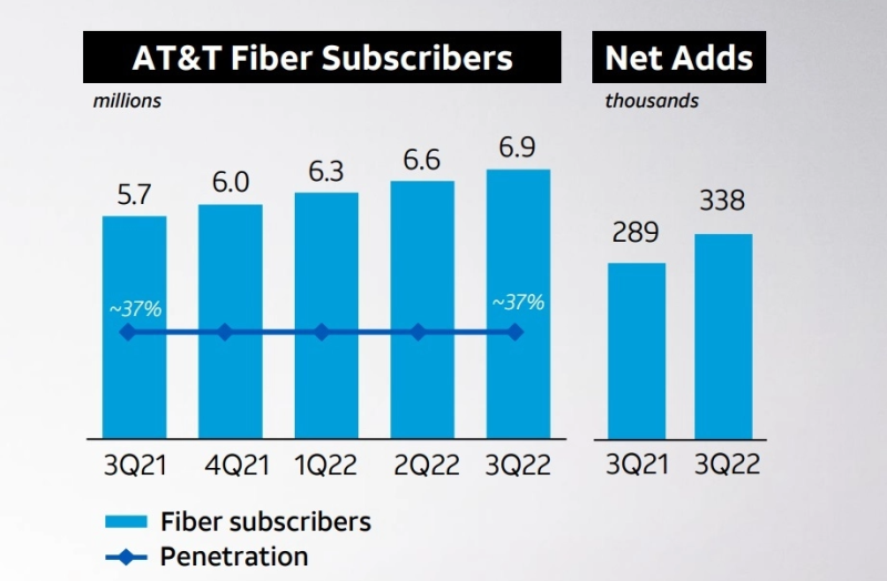 在第三季度,AT&T增加了33.8万光纤宽带用户,比去年同期的28.9万有所增加。这使得AT&T的光纤宽带用户数达到693万。