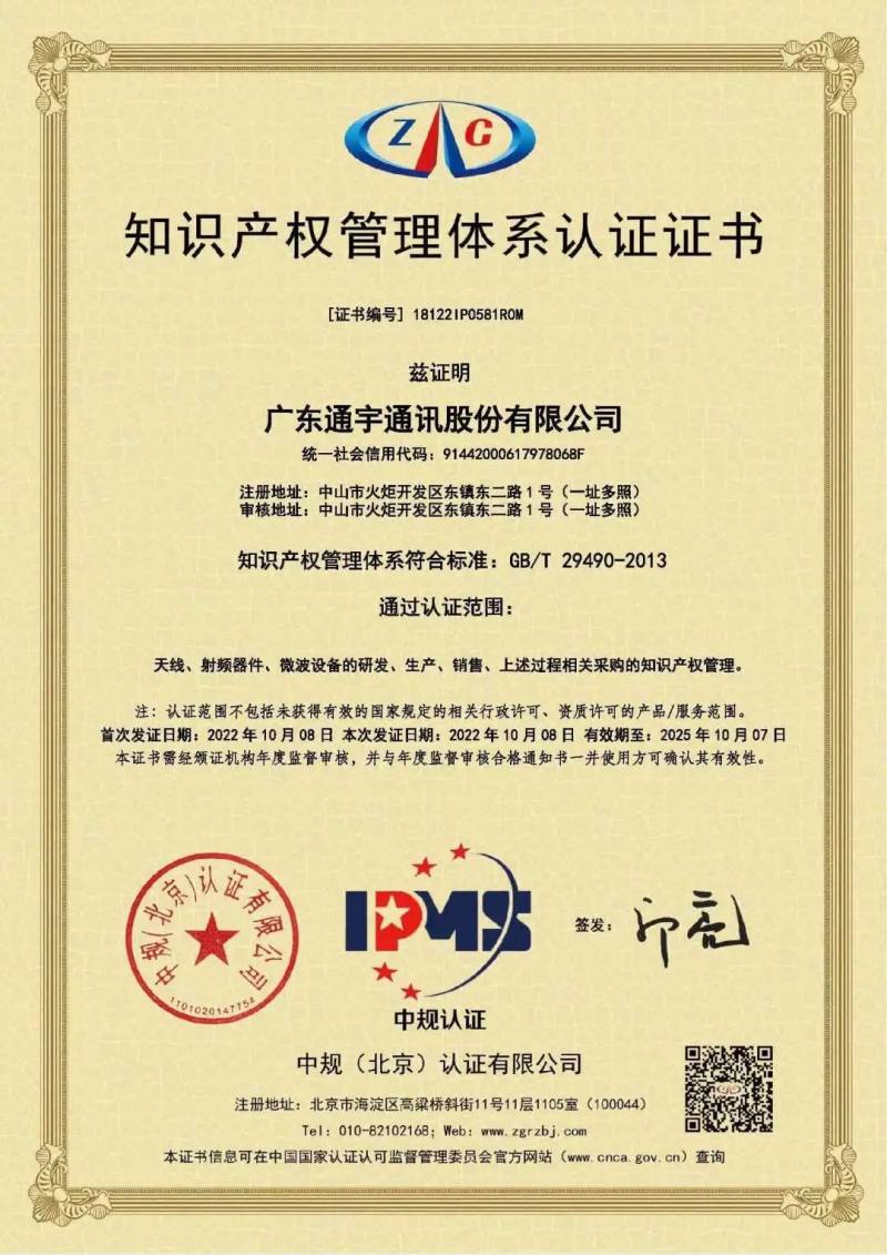 作为全球领先的通信解决方案设备商,通宇通讯高度重视知识产权管理和科技创新能力建设。此次,知识产权管理体系认证通过,证明通宇通讯作为国家知识产权优势企业和国家知识产权示范企业,对知识产权的科学管理和战略运用受到国家标准认可。