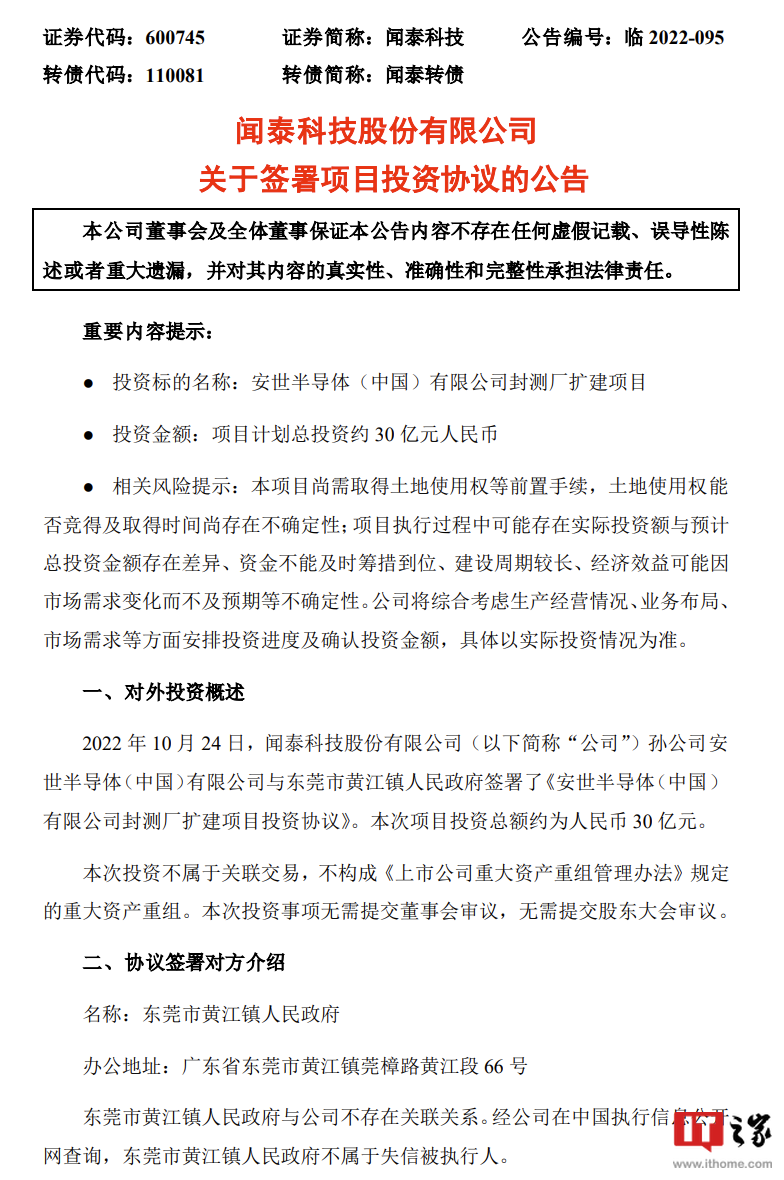 IT之家 10 月 26 日消息,从闻泰科技官方获悉,10 月 24 日,安世半导体(中国)有限公司封测厂扩建项目签约仪式在东莞黄江举行。仪式现场,闻泰科技孙公司安世半导体(中国)有限公司与东莞市黄江镇人民政府签署了《安世半导体(中国)有限公司封测厂扩建项目投资协议》。