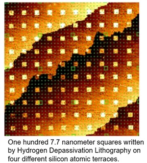 氢去钝化光刻(HDL)是电子束光刻(EBL)的一种形式,它通过非常简单的仪器实现原子分辨率,并使用能量非常低的电子。它使用量子物理学有效地聚焦低能电子和振动加热方法,以产生高度非线性(多电子)的曝光机制。HDL使用附着在硅表面的单层H原子作为非常薄的抗蚀剂层,并使用电子刺激解吸在抗蚀剂中创建图案。
